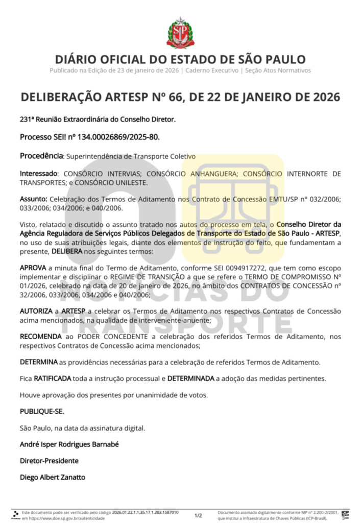 A deliberação, publicada no Diário Oficial do Estado em 23 de janeiro de 2026, autoriza a celebração dos aditamentos nos contratos EMTU/SP nº 032/2006, 033/2006, 034/2006 e 040/2006, firmados com os consórcios Intervias, Anhanguera, Internorte de Transportes e Unileste, e disciplina a implantação do regime de transição, em substituição às prorrogações contratuais que vinham sendo mantidas.
