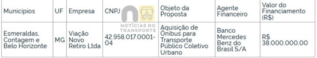 A empresa Viação Novo Retiro Ltda, que atua nas cidades de Esmeraldas, Contagem e Belo Horizonte, em Minas Gerais, foi selecionada para receber R$ 38.000.000,00 em financiamento, por meio do Banco Mercedes-Benz do Brasil S/A, para aquisição de ônibus destinados ao transporte público coletivo urbano.