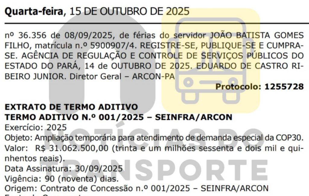 A Agência de Regulação e Controle de Serviços Públicos do Estado do Pará (ARCON-PA) publicou no Diário Oficial do Estado, no dia 15 de outubro de 2025, o Termo Aditivo nº 001/2025 – SEINFRA/ARCON, que autoriza a ampliação temporária da operação da BRT Amazônia para atender à demanda especial da COP30, que ocorrerá entre os dias 10 e 21 de novembro, em Belém (PA).