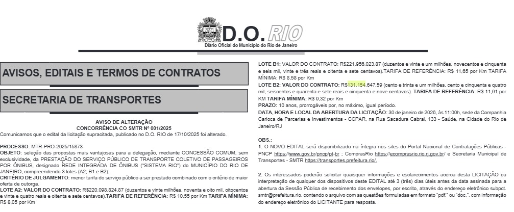 Entretanto, a concorrência enfrentou um resultado parcial: o lote B1, que inclui linhas consideradas mais estruturais e com rotas mais extensas na Zona Oeste carioca, não recebeu nenhuma proposta. Hoje a operação é conduzida em caráter emergencial pela Sancetur – Santa Cecília Turismo, da família Chedid. Com isso, a administração municipal informou que o trecho será relançado em novo certame, com a expectativa de atrair interessados em uma futura rodada de ofertas.