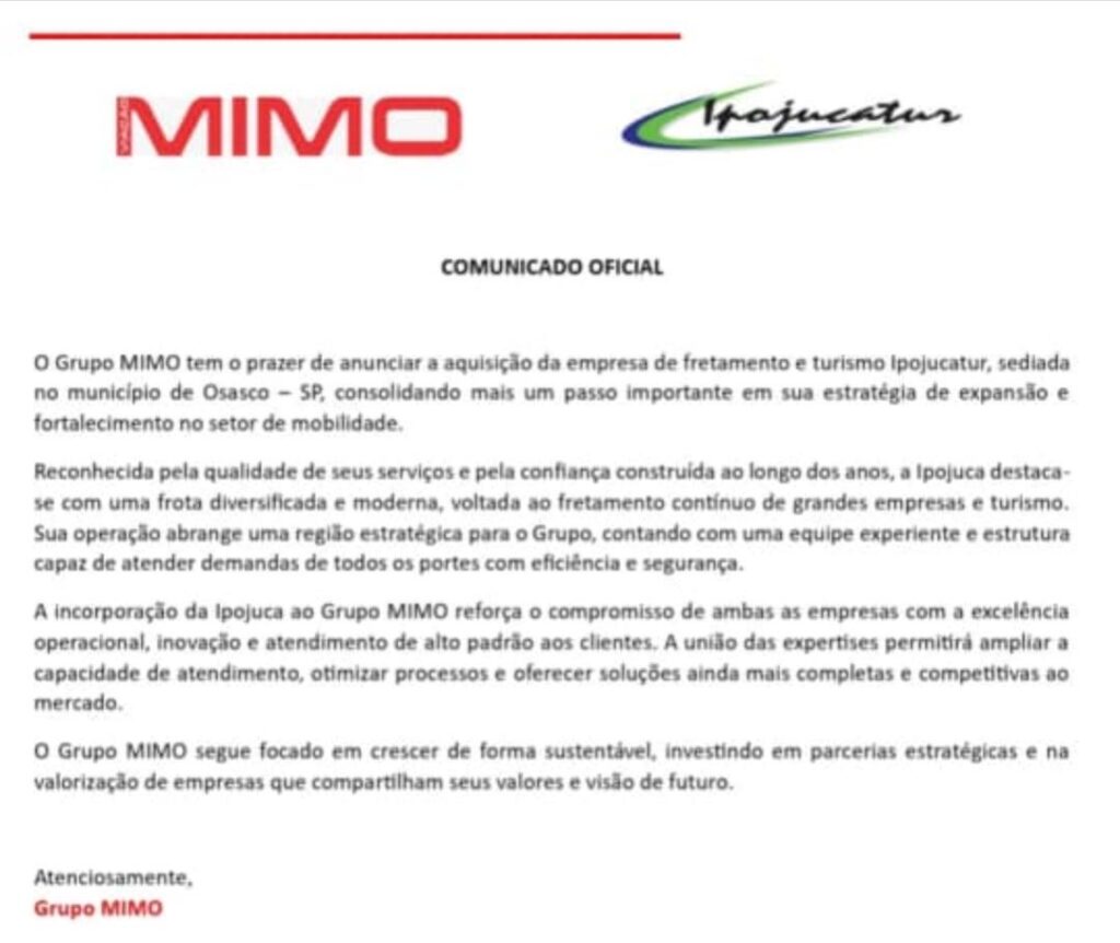 O Grupo MIMO oficializou a aquisição da Ipojucatur, com sede em Osasco. A negociação marca mais um passo na estratégia de crescimento do grupo no segmento de transporte de passageiros.