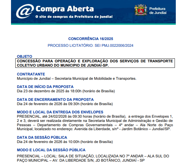 As propostas poderão ser apresentadas até 24 de fevereiro de 2026, com sessão pública marcada para o mesmo dia, no Paço Municipal de Jundiaí. O processo foi precedido por audiências públicas realizadas em diferentes regiões da cidade, incluindo Câmara Municipal, vetor Oeste e Terminal da Colônia.