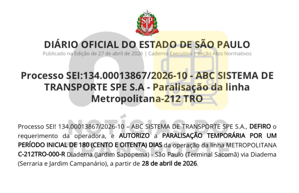 De acordo com o despacho, a empresa ABC Sistema de Transporte SPE S.A. (NEXT Mobilidade) teve seu pedido atendido pelas autoridades e está autorizada a suspender a operação da linha C-212TRO-000-R, que liga Diadema (Jardim Sapopema) ao Terminal Sacomã, na capital paulista.