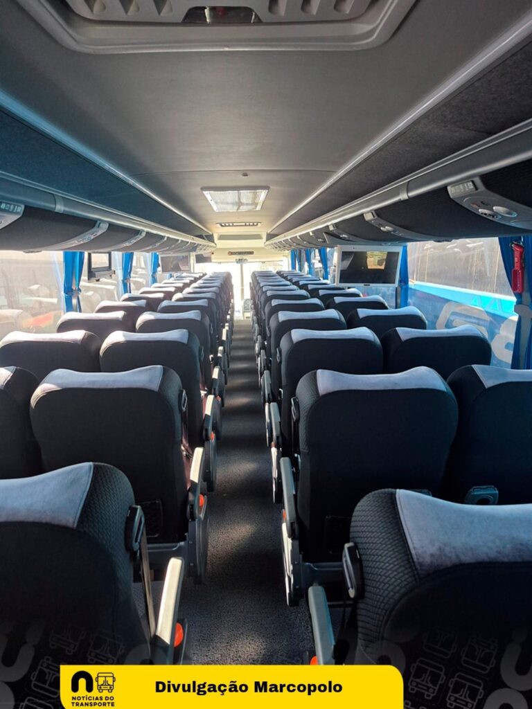 No salão de passageiros, há duas opções de configuração: 2×2, com 60 lugares, ou 3×2, com até 75 assentos. As poltronas possuem apoios de cabeça em espuma viscoelástica, garantindo maior conforto em viagens longas. O ônibus vem equipado com ar-condicionado Spheros de 136.500 BTUs, cintos de três pontos, sanitário traseiro e até três monitores de vídeo de 15 polegadas. Como opcionais, podem ser instalados geladeira e iluminação ambiente em LED duplo.