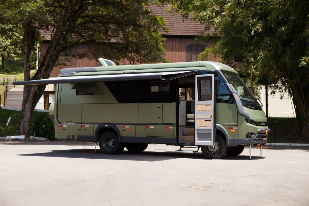 O NOMADE foi projetado para ser o motorhome definitivo para os aventureiros que buscam liberdade e sofisticação em suas jornadas. Com 7,5 metros de comprimento, 2,36 metros de largura e 3,18 metros de altura, o modelo integra a cabine do motorista e a parte habitável, proporcionando um design uniforme e amplo espaço para personalização. O foco no desempenho off-road é evidente, já que o veículo foi projetado como um modelo integral 4×4, pronto para enfrentar qualquer terreno.