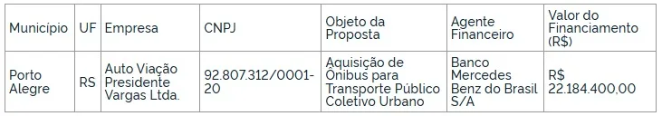 A tradicional Presidente Vargas, integrante do sistema municipal da capital gaúcha, foi contemplada com R$ 22,1 milhões. O agente financeiro será o Banco Mercedes-Benz, responsável por financiar a compra de novos veículos para Porto Alegre.
