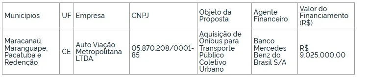 A Auto Viação Metropolitana, responsável por linhas em quatro municípios da Região Metropolitana de Fortaleza, obteve R$ 9,02 milhões para ampliar e modernizar sua frota. O crédito será repassado por meio do Banco Mercedes-Benz.