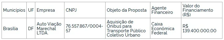 A Auto Viação Marechal, uma das principais operadoras do Distrito Federal, foi a empresa que recebeu o maior financiamento desta etapa. O crédito, concedido pela Caixa Econômica Federal, será destinado à aquisição de novos ônibus para reforçar a operação no sistema de transporte coletivo de Brasília.