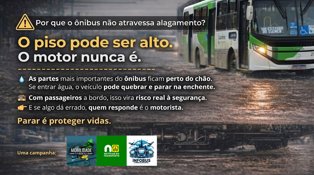 Para ampliar esse entendimento fora do calor do momento, o Portal Notícias do Transporte junto às páginas Mobilidade Guarulhense e Infobus – Cidade Guarulhos, lançaram uma campanha conjunta de conscientização, explicando de forma direta por que atravessar áreas alagadas não é uma escolha segura, nem para quem está ao volante, nem para quem está a bordo.
