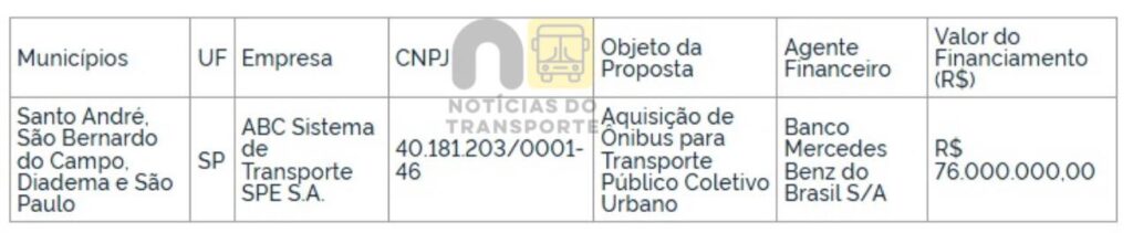 O investimento será implementado com recursos do Fundo de Garantia do Tempo de Serviço (FGTS), tendo o Banco Mercedes-Benz do Brasil S/A como agente financeiro.