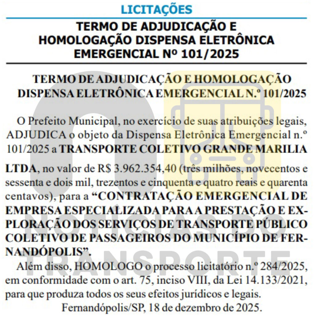 A Prefeitura de Fernandópolis, no interior de São Paulo, oficializou a contratação emergencial de uma nova operadora para a prestação dos serviços de transporte público no município. A decisão foi formalizada por meio do Termo de Adjudicação e Homologação da Dispensa Eletrônica Emergencial nº 101/2025, publicado em 19 de dezembro de 2025.
