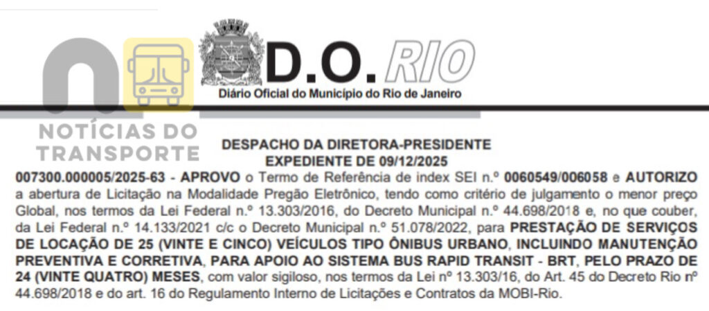 A Prefeitura do Rio de Janeiro autorizou oficialmente a abertura de uma licitação para a locação de 25 ônibus urbanos, destinados ao apoio operacional do sistema BRT, conforme publicado no Diário Oficial desta terça-feira (10). A contratação será realizada por meio de Pregão Eletrônico, com julgamento pelo menor preço global e validade contratual de 24 meses.