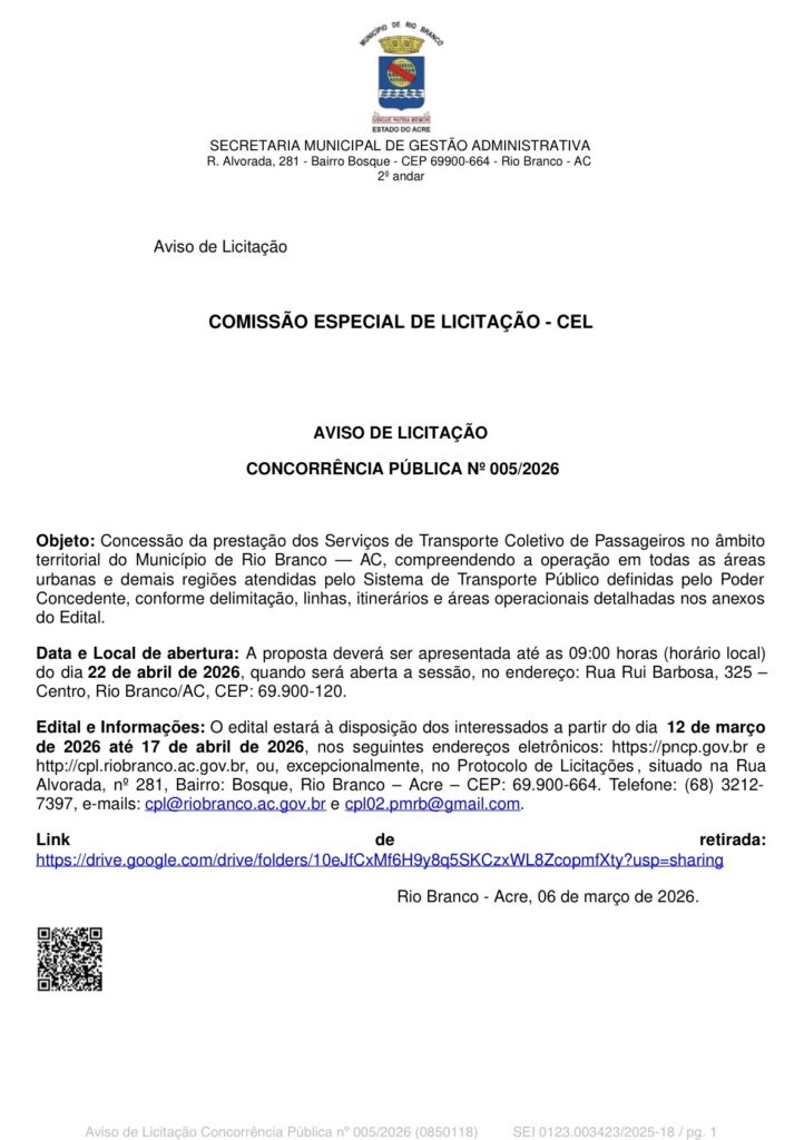 A Prefeitura de Rio Branco publicou o edital de licitação que irá definir a nova concessionária responsável pela operação do transporte coletivo urbano da capital acreana. O processo busca estabelecer um modelo definitivo para o sistema, que atualmente funciona por meio de contratos emergenciais.