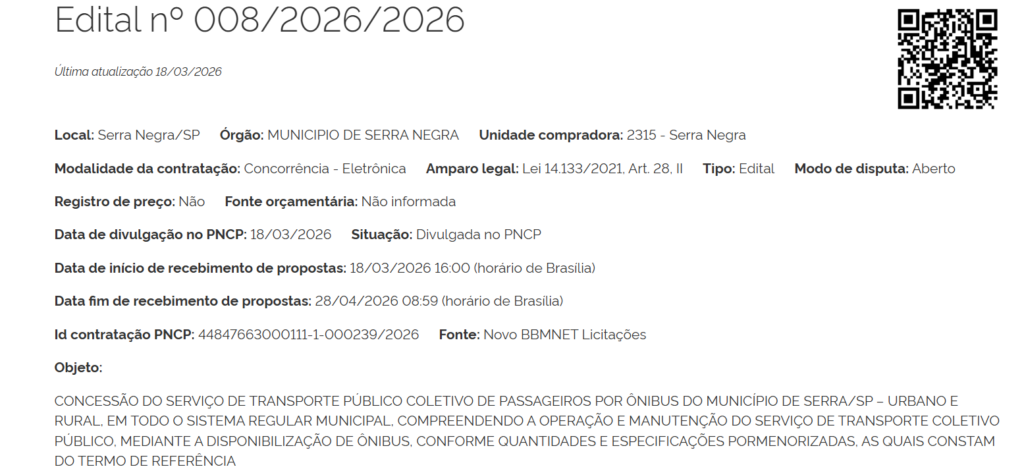 A Prefeitura de Serra Negra, no interior de São Paulo, abriu a nova licitação para a concessão do transporte coletivo urbano e rural do município. O processo, estruturado na modalidade de concorrência eletrônica nº 008/2026, prevê uma concessão de 15 anos e receberá propostas das empresas interessadas até as 9h do dia 28 de abril de 2026, quando será realizada a sessão pública de abertura na plataforma BBMNET.