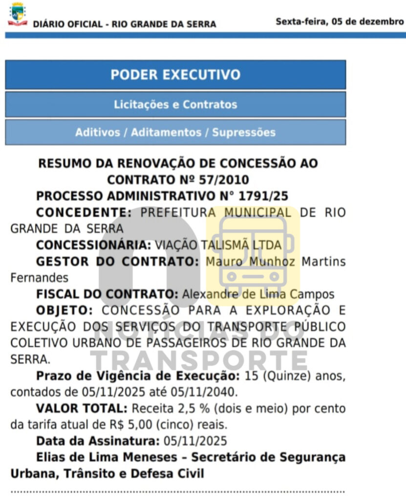A Viação Talismã confirmou ao Portal Notícias do Transporte a renovação do seu contrato de prestação de serviços em Rio Grande da Serra por mais 15 anos. O acordo inicial havia sido firmado em 2010, com validade de 15 anos e possibilidade de renovação por igual período.