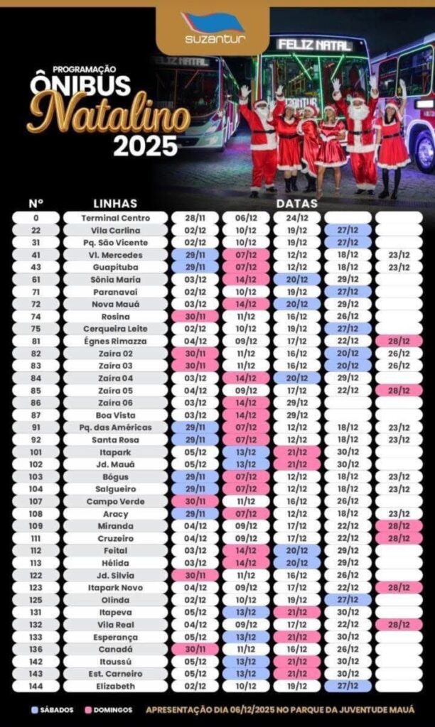 A Suzantur divulgou o cronograma especial de circulação dos ônibus natalinos, que incluem itinerários por diversos bairros do município. A programação completa você confere na imagem abaixo: